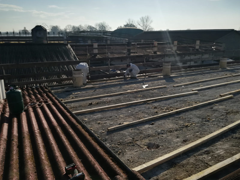 ISOMEC ha proceduto quindi con la bonifica della copertura, mediante rimozione delle vecchie lastre successivamente ad una prima fase di incapsulamento al fine di evitare la dispersione delle fibre d’amianto durante i lavori di rimozione (vedi foto 2 e 3).