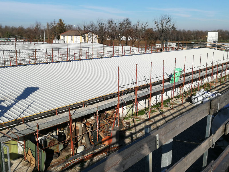 Stratigrafia: nuova copertura in pannelli sandwich rivestiti in acciaio e vetroresina con coibentazione in schiuma poliuretanica su orditura secondaria in listelli di legno d’abete
