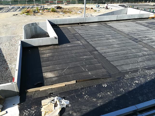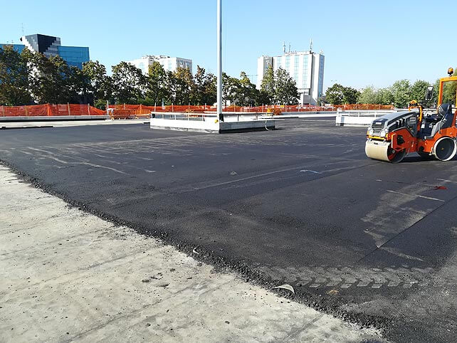 L’intervento si è concluso con la realizzazione di circa 6.000 mq di copertura carrabile, destinati al parcheggio del centro commerciale. Ancora una volta si è optato per l’impiego di un manto continuo in bitume polimero biarmato da 5 mm (vedi foto 8), che ha consentito di gettare direttamente l’asfalto sulla guaina stessa.