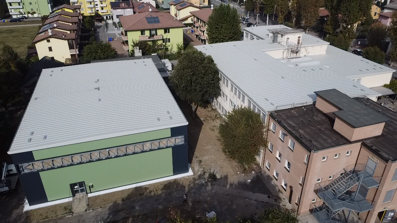 - L’intervento è stato compiuto attraverso il rifacimento del manto impermeabile della copertura, il fissaggio meccanico del doppio strato di manto impermeabile esistente, per poi posare a freddo il nuovo manto impermeabile Fire resistant e UV resistant DERBIGUM SPR FR 4 mm con contenuto di riciclato.