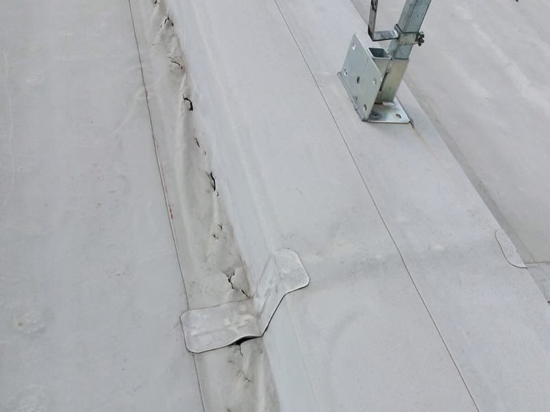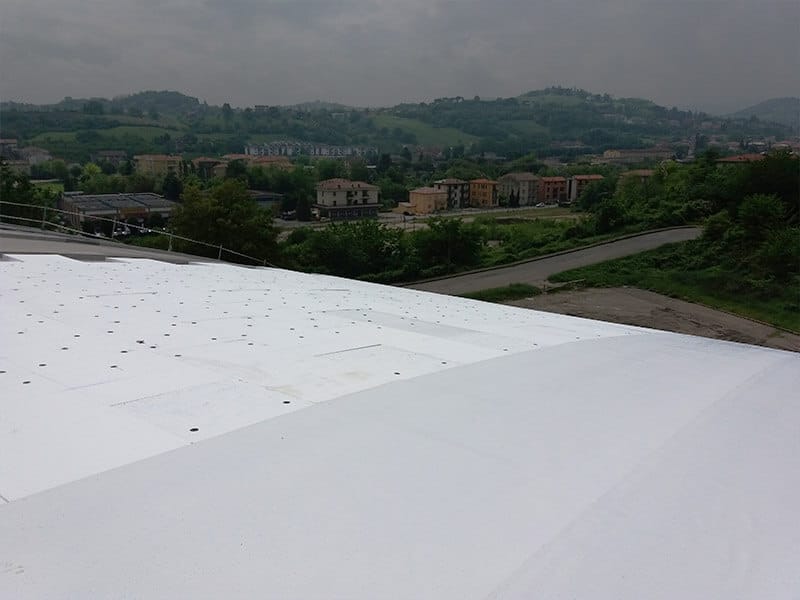Infine viene posato il nuovo manto impermeabile sintetico in poliolefina flessibile armato con velo di vetro, dello spessore di mm1,8, accoppiato sulla superficie inferiore a feltro non tessuto in poliestere del peso di 200 g/m2. La colorazione bianca (Smart White) consente alla copertura di raggiungere valori di riflettanza SRI (Solar Reflectance Index) pari a 102 con conseguenti benefici in termini di consumi energetici durante l’estate. Il manto è fissato ai pannelli mediante adeguato collante poliuretanico (vedi foto 4, 5 e 6).