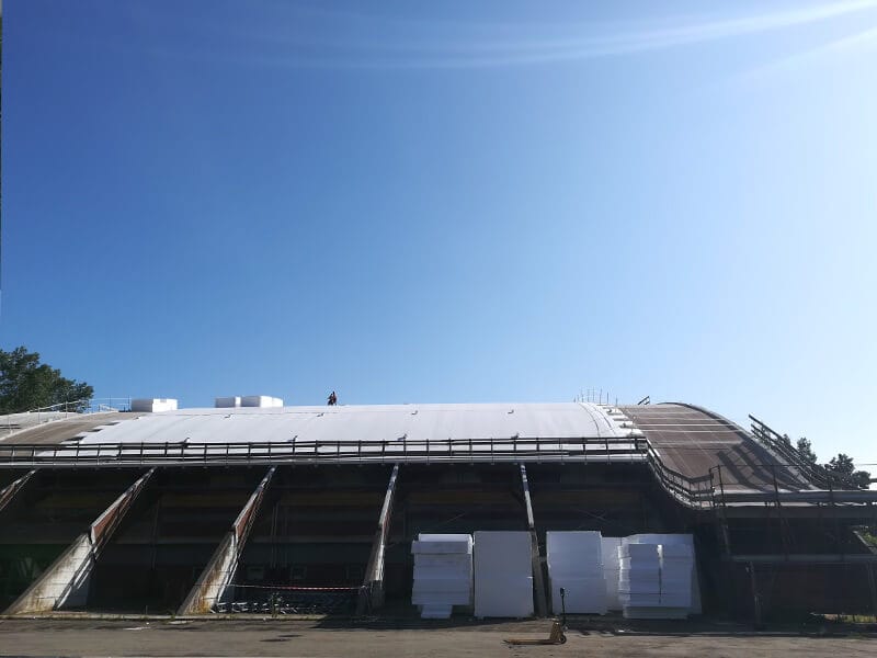La copertura del Palazzetto dello Sport di Salsomaggiore era già stata oggetto di ricopertura del manto in alluminio grecato con un manto in PVC ed isolamento termico in EPS, ancor prima del collaudo oltre 20 anni or sono, sempre a cura della ditta ISOMEC srl. Nel 2017, il Comune appalta i lavori di rifacimento del manto, ormai completamente usurato da parte degli agenti atmosferici (vedi foto 1).